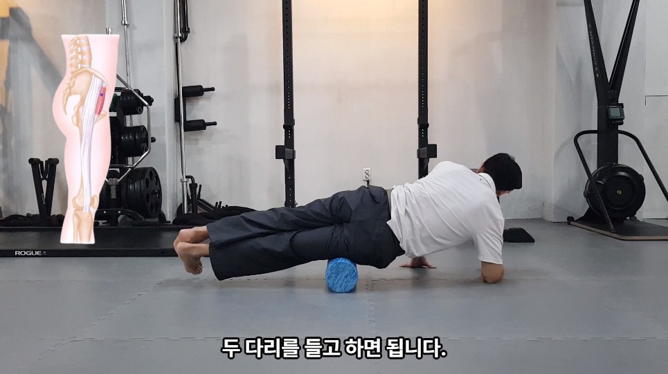 폼 롤러를 허벅지 밑에 두고 하면 됩니다. 다리를 올리거나 엉덩이를 들어서 강도 조절을 할 수 있습니다.