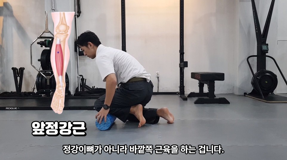 정강이뼈가 아니라 바깥쪽 근육을 합니다. 몸을 약간 틀어 위아래로 롤링합니다.