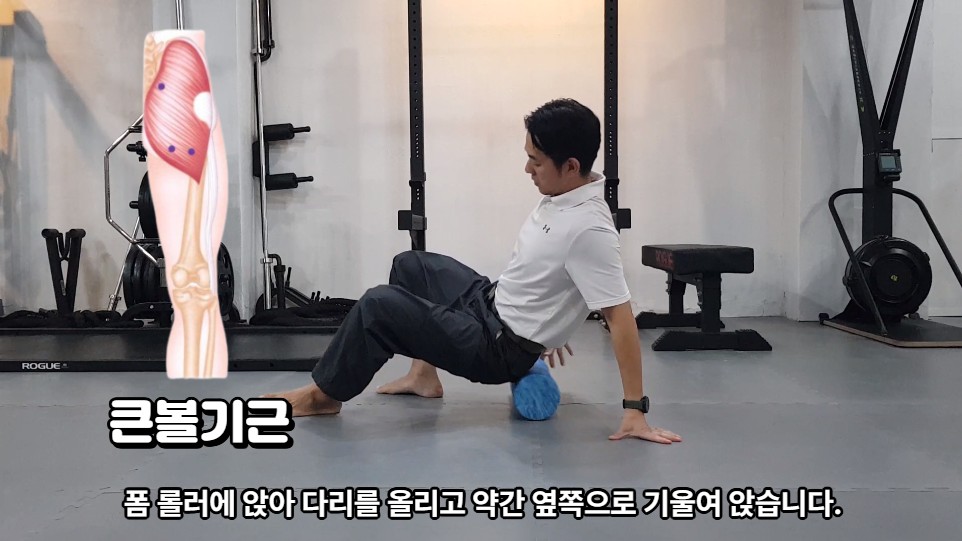 폼롤러에 앉아 다리를 올리고 약간 옆쪽으로 기울여 앉습니다. 다리 올린 쪽 엉덩이를 롤링합니다.