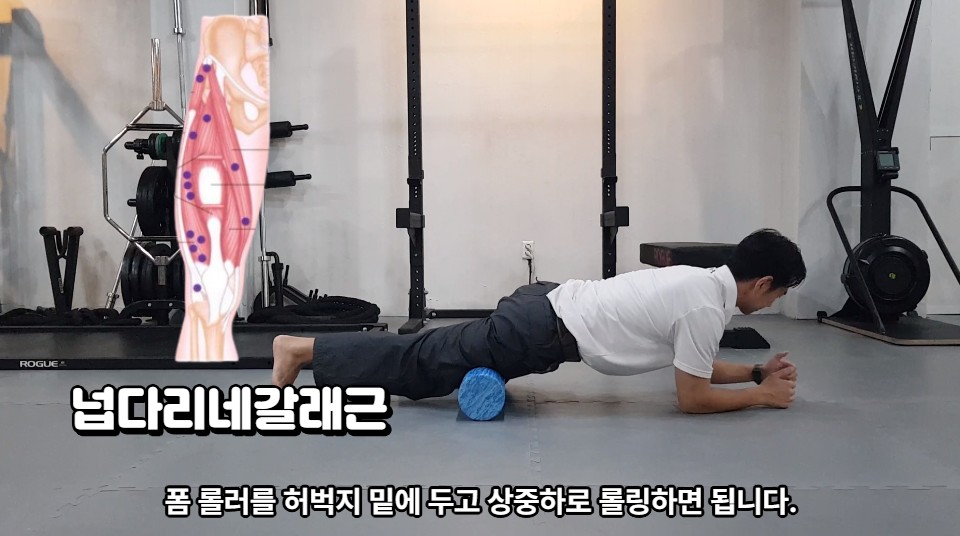 폼 롤러를 허벅지 밑에 두고 상중하로 롤링합니다. 한 다리가 힘들면 두 다리로 합니다.