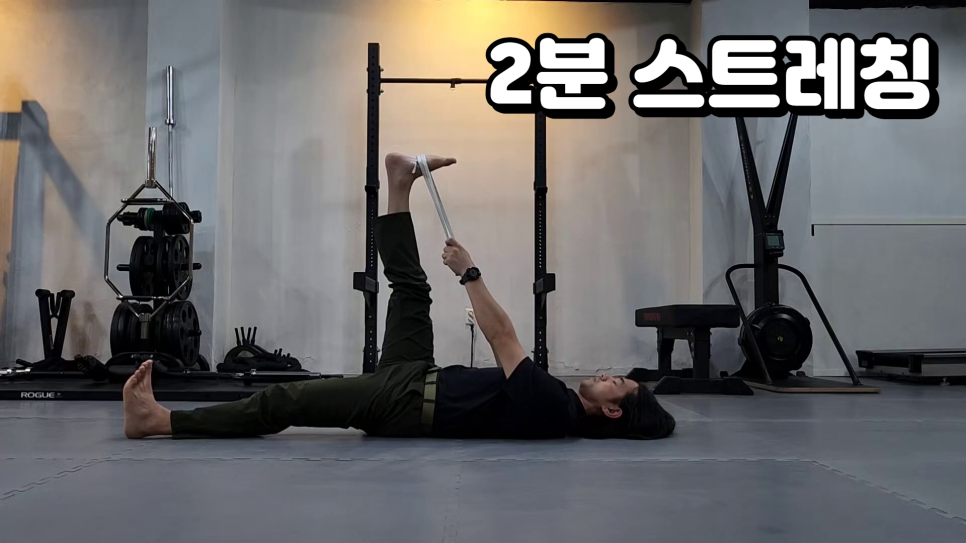 바닥에 누워 발바닥에 수건 또는 요가벨트를 걸고 2분 동안 스트레칭합니다. 뒤허벅지가 너무 당긴다면 무릎을 구부리고 해도 됩니다.