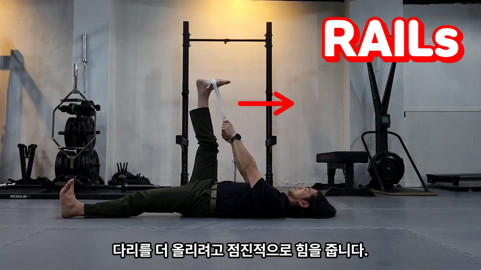 두번째 동작(RAILs)은 다리를 가슴쪽으로 더 올리려고 하고 팔은 당기려고 하지말고 힘을 빼고 있으면 됩니다. 20초동안 점진적으로 강한 힘을 주면 됩니다.