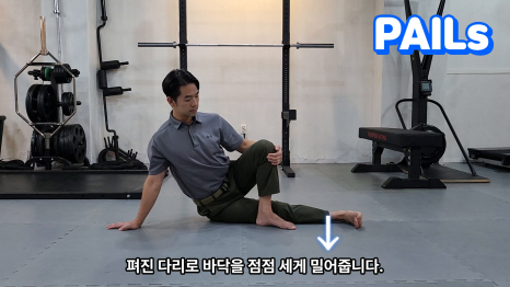첫번째 동작은 펴진 다리로 바닥을 눌러줍니다.