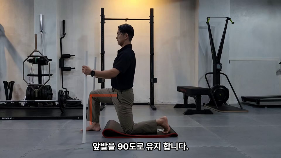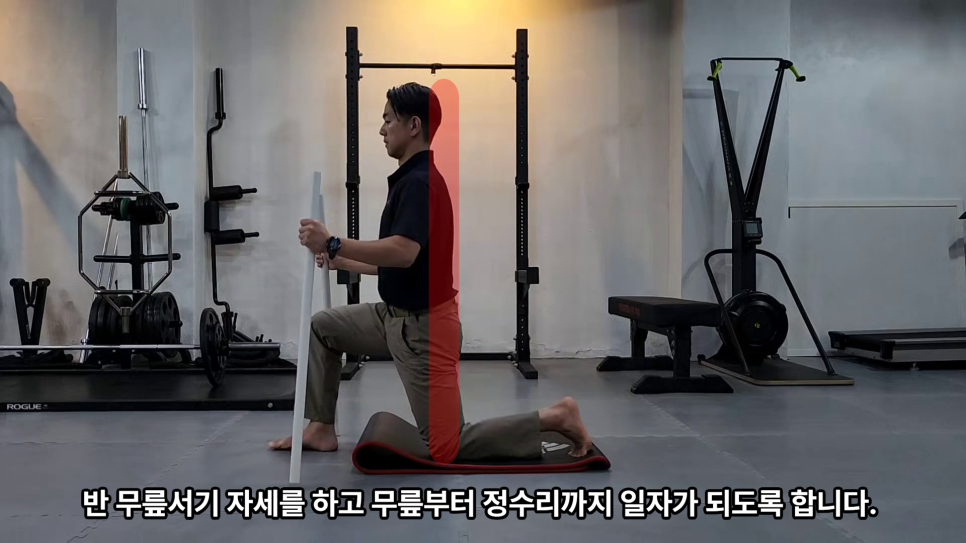 반 무릎서기 자세를 하고 2분간 스트레칭합니다.