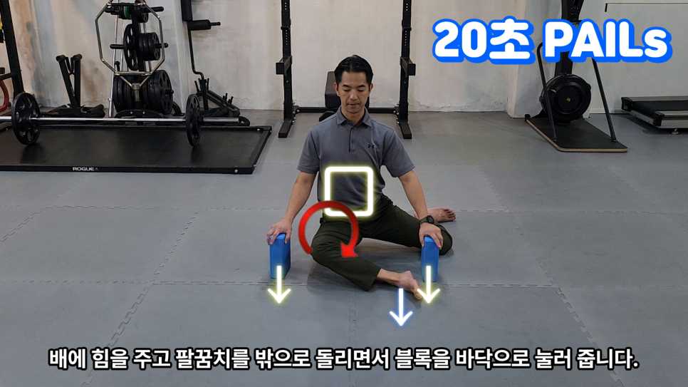 - 배에 힘을 주고 팔꿈치를 밖으로 돌리면서 블럭을 바닥으로 눌러 줍니다.