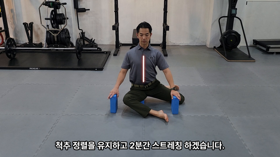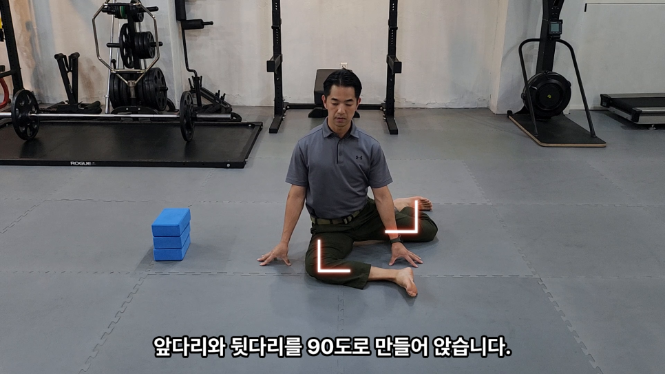 90/90 자세로 앉습니다. 이 때 고관절에 불편함을 느낀다면 블럭 등을 깔고 앉습니다.