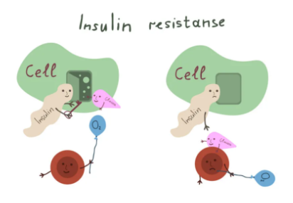 인슐린 농도 상승 → 인슐린 저항성 증가 → 혈당 증가 → 인슐린 저항성 증가 → 인슐린 농도 상승 → 고혈당 → 인슐린 농도 상승