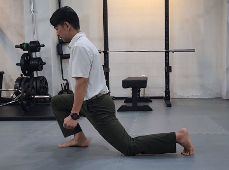 무릎을 앞으로 최대한 보낸 상태에서 2분간 스트레칭합니다. 이 때 뒤꿈치가 들리지 않아야 합니다.