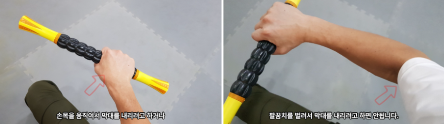 아래팔뼈를 들릴 때 팔꿈치를 펴려고 하거나 손목을 움직여서 막대를 내리려고 하면 안 됩니다. 또한 팔꿈치를 벌려서 막대를 내리려고 해서도 안 됩니다.