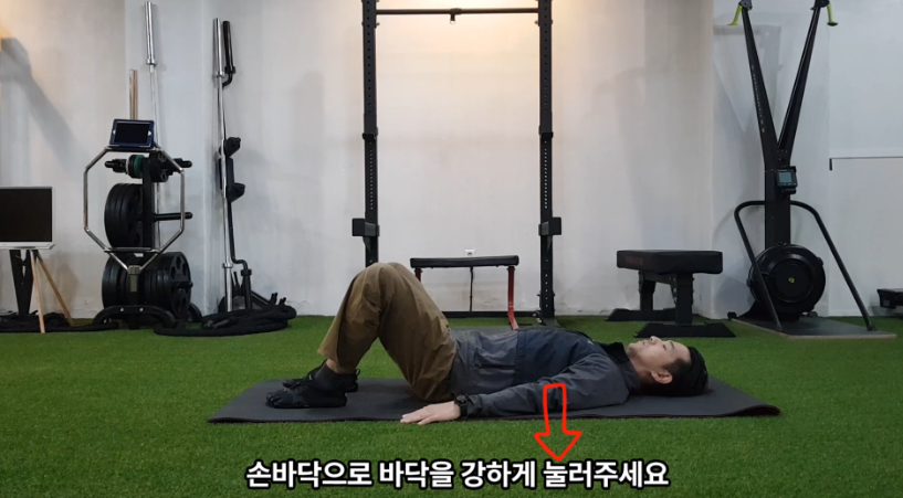 바닥에 누워 무릎을 구부립니다. 손바닥으로 바닥을 강하게 눌러주면 등 뒤에 힘이 들어가는 것을 느낄 수 있습니다.