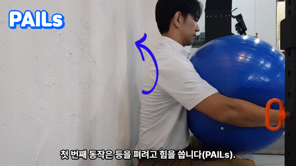 배에 힘을 주고 허리가 벽에서 떨어지지 않게 등을 펴려고 힘을 줍니다.