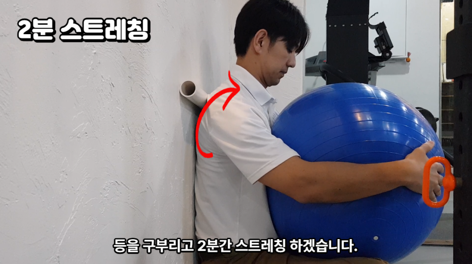 허리를 벽에 붙이고 동그란 막대 등을 뒤에 놓고 2분간 스트레칭합니다.
