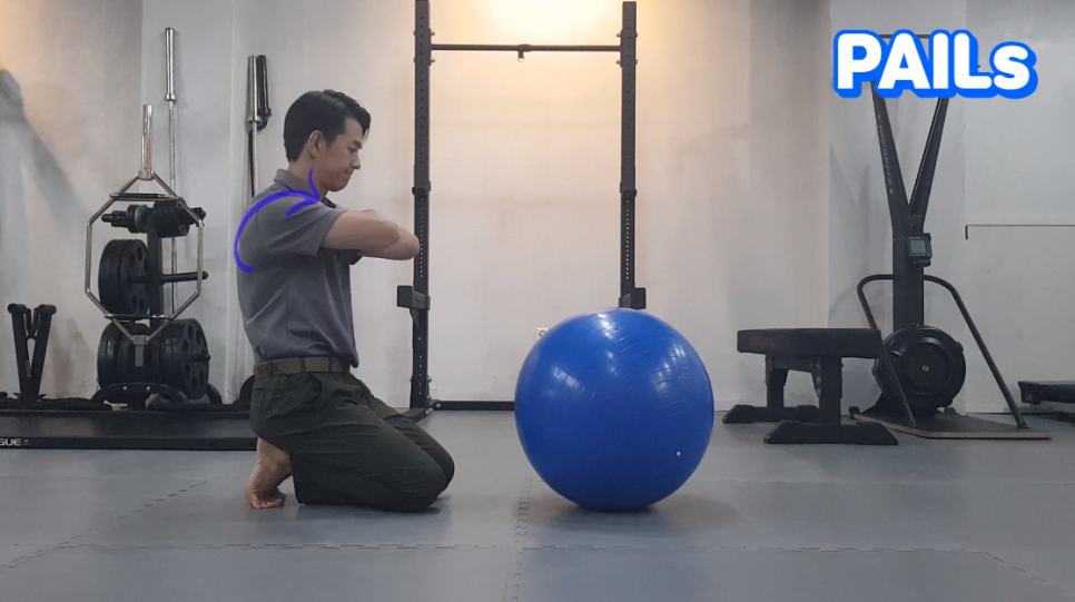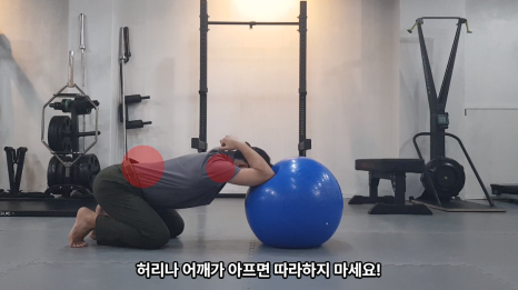 배에 힘을 주고 어깨관절을 사용하는 것이 아니라 등을 구부려 팔꿈치로 짐볼을 눌러 줍니다.