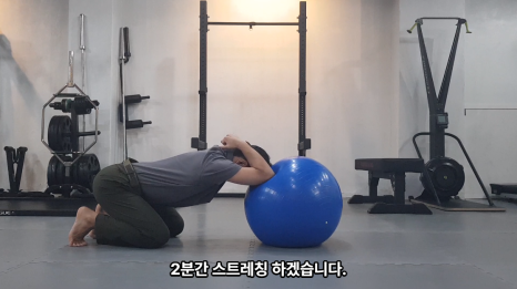 네 발 기는 자세에서 팔꿈치를 짐볼위에 놓고 2분간 스트레칭 합니다. 엉덩이를 뒤꿈치와 가깝게 해야 허리에 부담이 적습니다. 짐볼 대신 벤치를 이용해도 됩니다. 매트나 쿠션을 무릎에 대고 하면 좋습니다:D